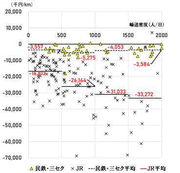 輸送密度(横軸)と営業キロあたりの営業赤字(縦軸)